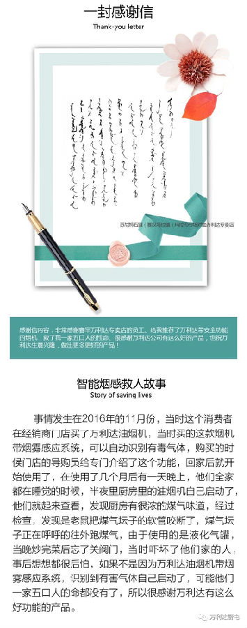 很多人家里,还是用着7、8年的老旧油烟机,无论是机器工况,还是抽烟效果,都差强人意。经过上面这个故事,我们发现,一台好的烟机,让消费者用的放心,很重要,但让消费者用的安心我们更是责无旁贷!